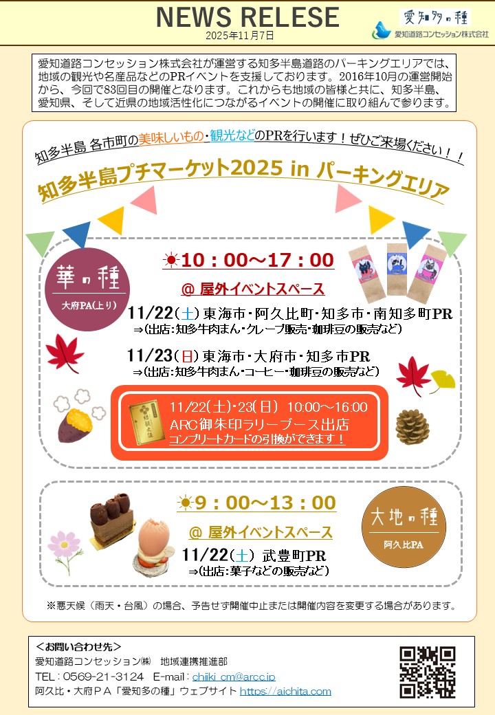今年も、大府パーキングエリア(上り)と阿久比パーキングエリア(下り)にて、